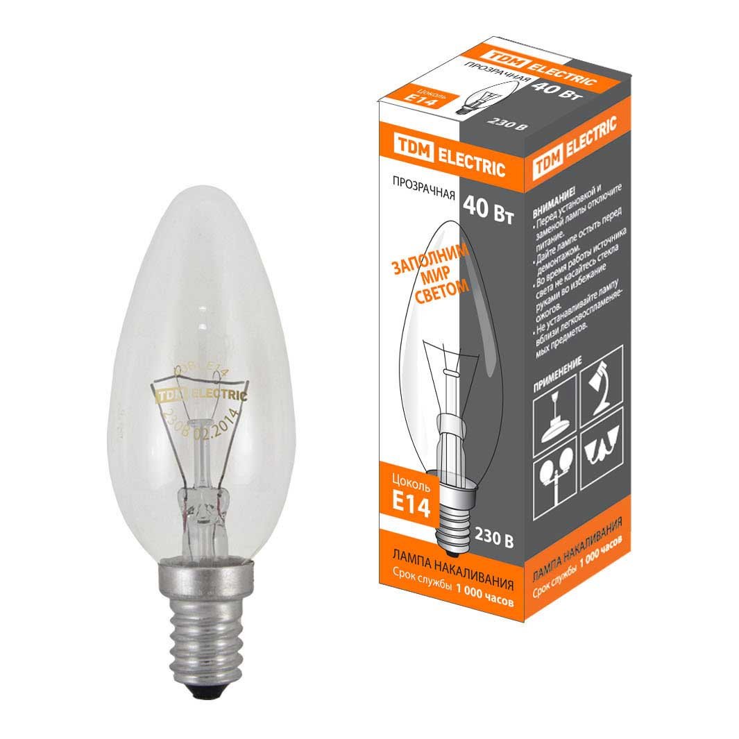 Лампа накаливания в форме свечи с цоколем E14 и размерами 100 мм по высоте и диаметром в 35 мм обладает мощностью в 40 W, благодаря чему она может осветить 2.7 кв. м. Изделие рассчитано на использование в сети с переменным напряжением в 220-240В.