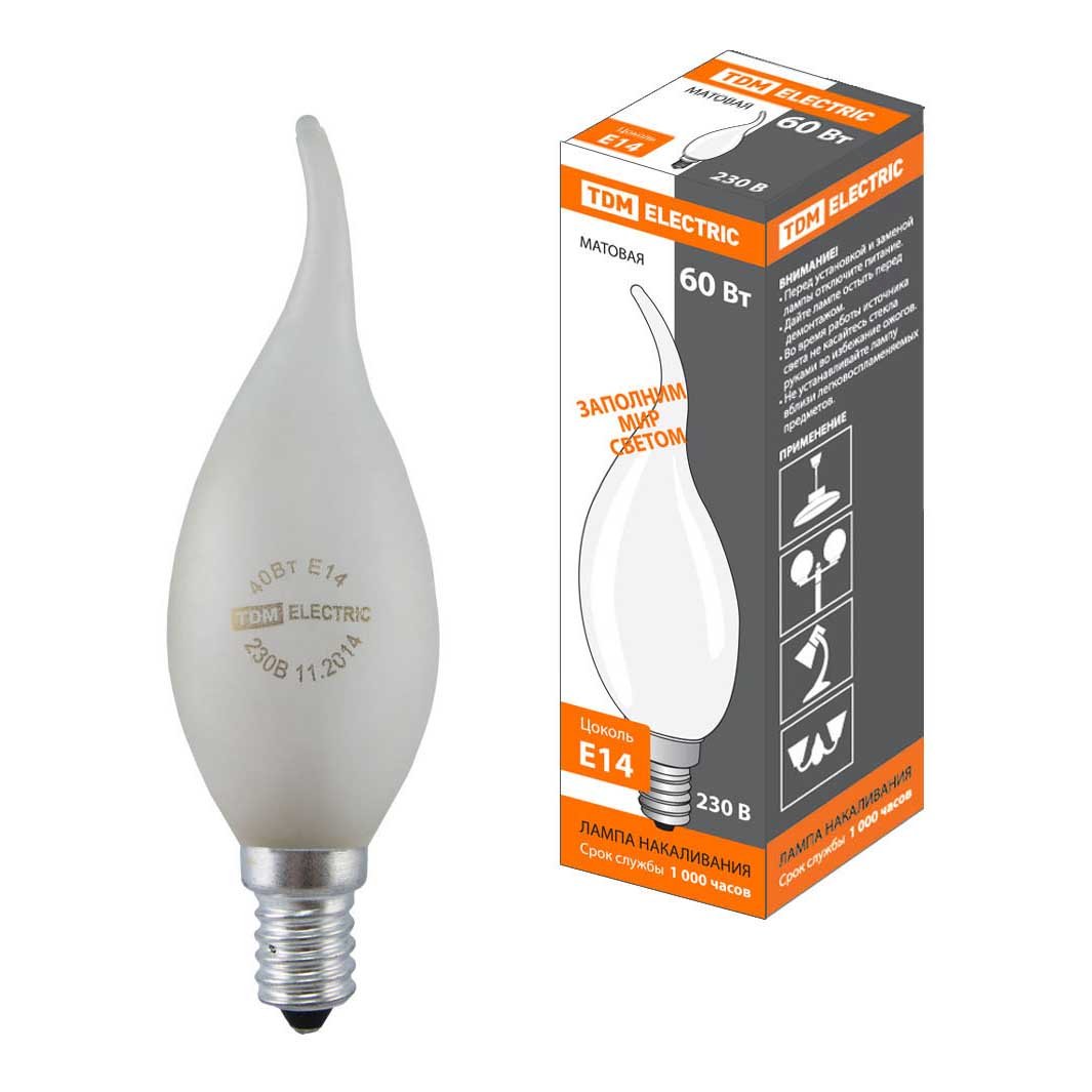 Лампа накаливания в форме свечи на ветру с цоколем E14 и размерами 120 мм по высоте и диаметром в 35 мм обладает мощностью в 60 W, благодаря чему она может осветить 4 кв. м. Изделие рассчитано на использование в сети с переменным напряжением в 220-240В.
