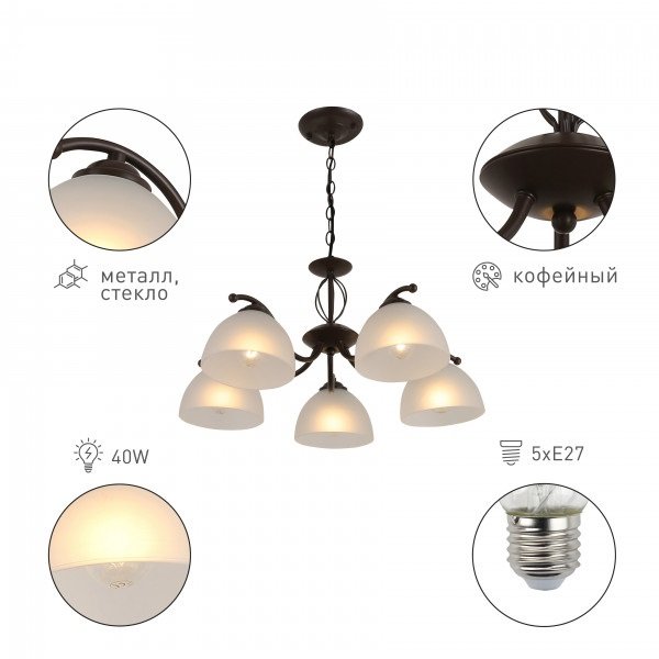 Незаурядная модель 9141-305 от итальянской компании Rivoli относится к коллекции Jackeline и отлично подойдет для установки на потолок в гостиной, оформленной в классическом стиле. Подвесная люстра Rivoli Jackeline 9141-305 Б0054758 с полукруглыми плафонами осветит помещение площадью 15 кв. м. Производитель Rivoli рекомендует использовать для устройства светодиодные лампы с цоколем E27 и мощностью 40 W. Прибор произведен с использованием материалов: металл и стекло и может использоваться для натяжного потолка. Основным цветом товара является Кофейный и Белый. Подвесная люстра 9141-305 Б0054758 продается по цене 7215 руб. Торопитесь сделать заказ в интернет-магазине Top Otdelka.
