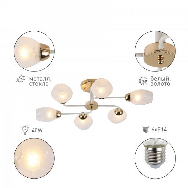 Невероятная модель 3128-306 от итальянской компании Rivoli относится к коллекции Sabre и отлично подойдет для установки на потолок в гостиной, оформленной в стиле модерн. Потолочная люстра Rivoli Sabre 3128-306 Б0054862 с овальными плафонами осветит помещение площадью 18 кв. м. Производитель Rivoli рекомендует использовать для устройства светодиодные лампы с цоколем E14 и мощностью 40 W. Прибор произведен с использованием материалов: металл и стекло и может использоваться для натяжного потолка. Основным цветом товара является Золотой и Белый. Потолочная люстра 3128-306 Б0054862 продается по цене 7582 руб. Торопитесь сделать заказ в интернет-магазине Top Otdelka.