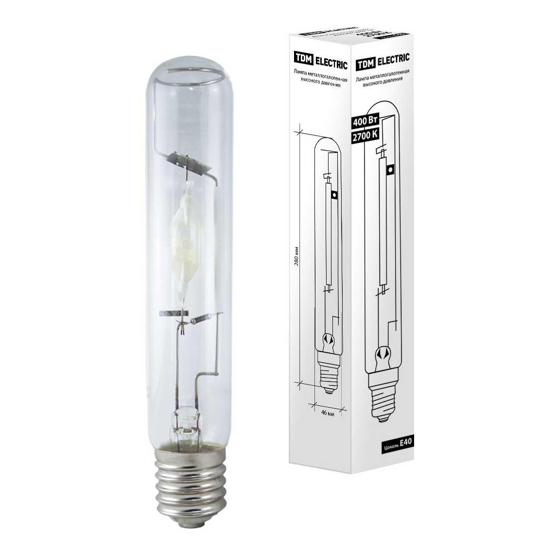 Металлогалогеновая лампочка трубчатой формы с цоколем E40 и размерами 280 мм по высоте и диаметром в 46 мм обладает мощностью в 400 W, благодаря чему она может осветить 50 кв. м. Цветовая температура – 2700 К, т.е. теплый свет, создающий атмосферу уюта. Изделие рассчитано на использование в сети с переменным напряжением в 220-240В.