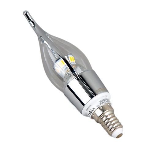 Светодиодная лампочка в форме свечи на ветру с цоколем E14 и размерами 119 мм по высоте и диаметром в 37 мм обладает мощностью в 5 W, благодаря чему она может осветить 1.7 кв. м. Цветовая температура – 3000 К, т.е. теплый свет, создающий атмосферу уюта. Изделие рассчитано на использование в сети с переменным напряжением в 220-240В. Лампа может изменять силу свечения при использовании в технике, поддерживающей технологию диммирования.