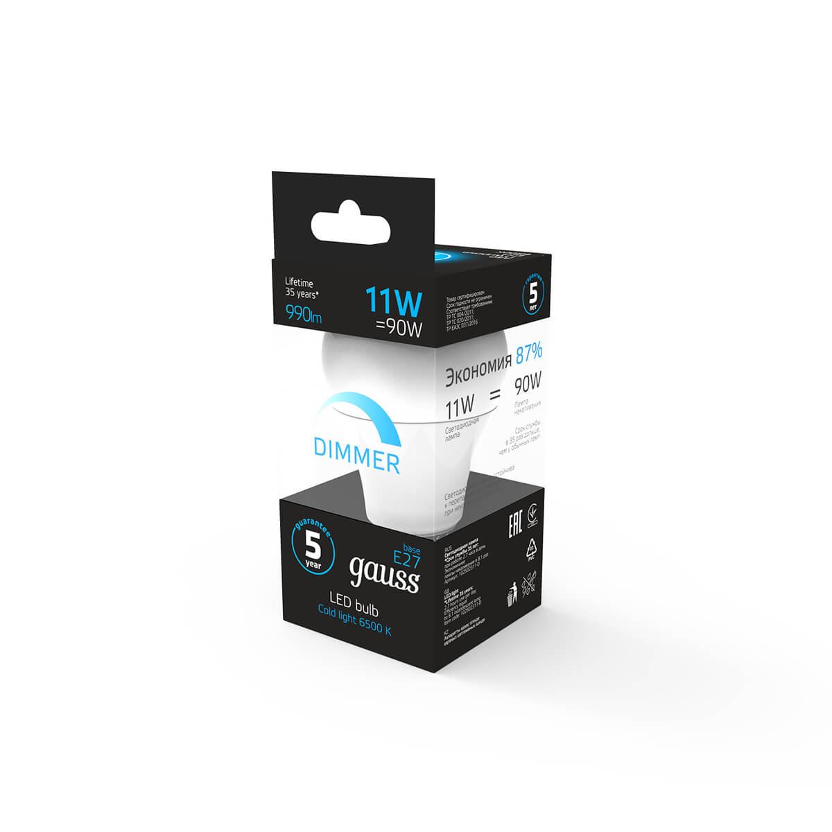 Светодиодная лампочка в форме груши с цоколем E27 и размерами 110 мм по высоте и диаметром в 60 мм обладает мощностью в 11 W, благодаря чему она может осветить 3.7 кв. м. Цветовая температура – 4100 К, т.е. белый свет, подходящий для рабочего настроя (не рекомендуется для детской комнаты). Изделие рассчитано на использование в сети с переменным напряжением в 220В. Лампа может изменять силу свечения при использовании в технике, поддерживающей технологию диммирования.
