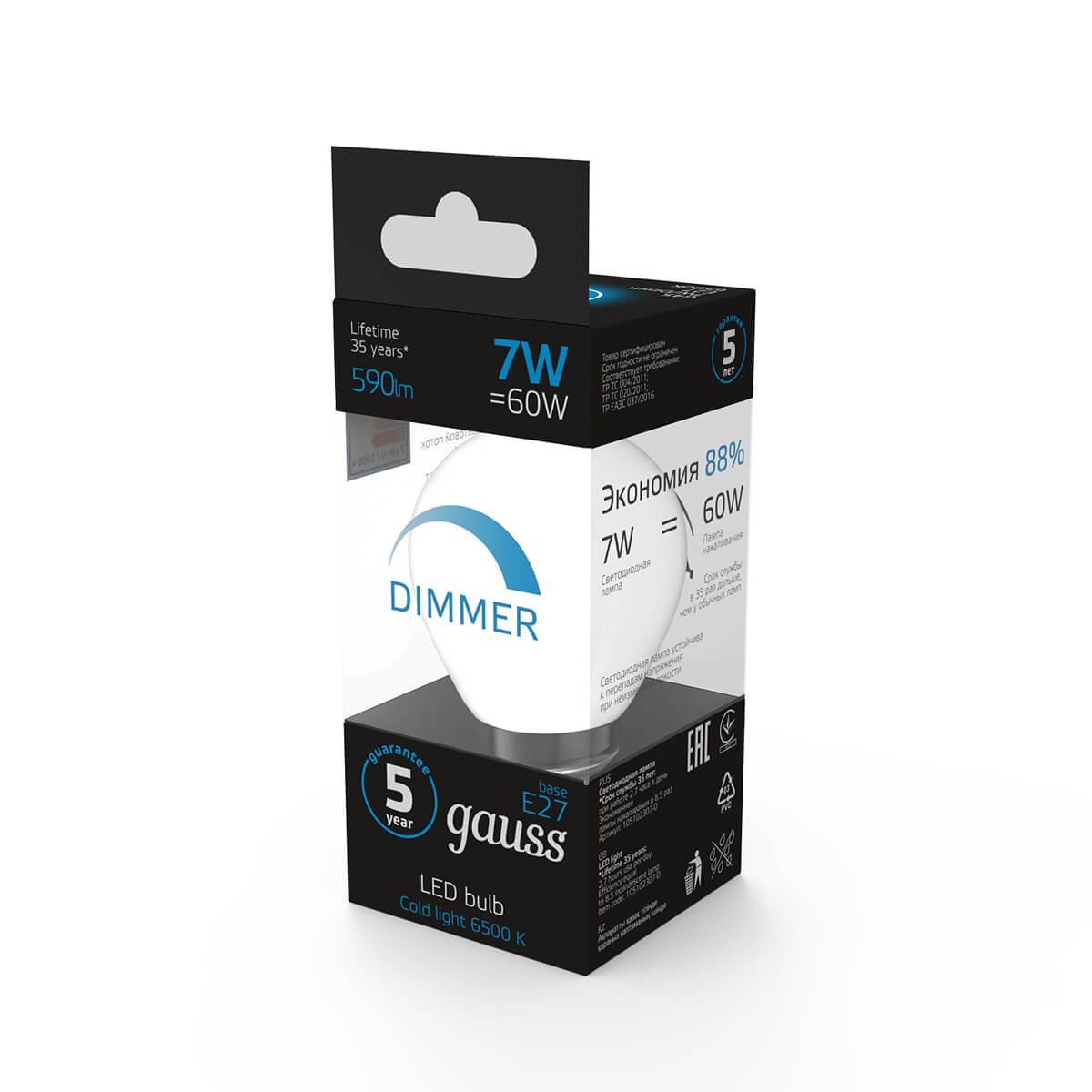 Светодиодная лампочка в форме шара с цоколем E27 и размерами 110 мм по высоте и диаметром в 60 мм обладает мощностью в 7 W, благодаря чему она может осветить 3.5 кв. м. Цветовая температура – 6500 К, т.е. холодный свет синего оттенка (не рекомендуется для применения на кухне, так как искажает цвет готовых блюд). Изделие рассчитано на использование в сети с переменным напряжением в 240В. Лампа может изменять силу свечения при использовании в технике, поддерживающей технологию диммирования.