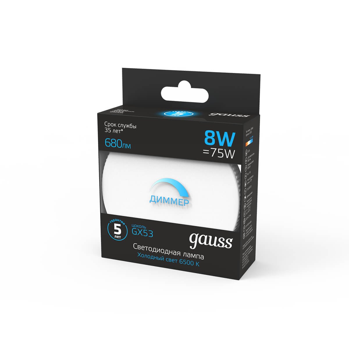 Светодиодная лампочка в форме таблетки с цоколем GX53 и размерами 24 мм по высоте и диаметром в 75 мм обладает мощностью в 8 W, благодаря чему она может осветить 4 кв. м. Цветовая температура – 6500 К, т.е. холодный свет синего оттенка (не рекомендуется для применения на кухне, так как искажает цвет готовых блюд). Изделие рассчитано на использование в сети с переменным напряжением в 230В. Лампа может изменять силу свечения при использовании в технике, поддерживающей технологию диммирования.
