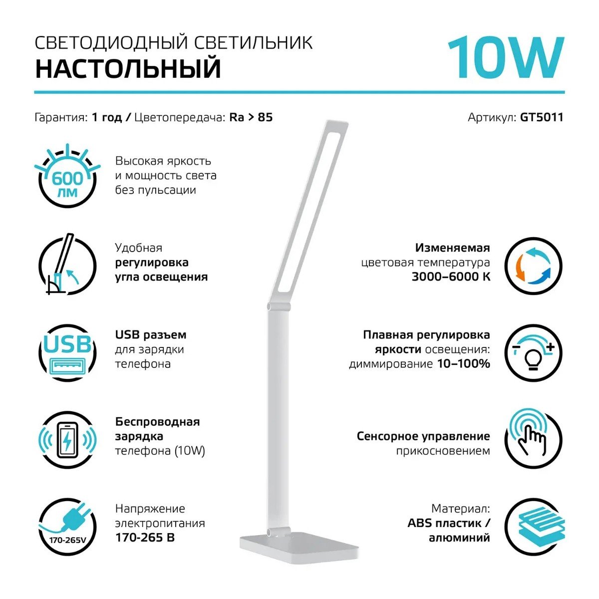 Выдающаяся модель GT5011 от российской компании Gauss и отлично подойдет для установки на стол офиса, оформленном в современном стиле. Осветительный элемент встроен в конструкцию и не требует приобретения дополнительных лампочек. Прибор произведен с использованием материала: пластик. Основным цветом товара является Белый. Настольная светодиодная лампа GT5011 с диммером продается по цене 4250 руб. Торопитесь сделать заказ в интернет-магазине Top Otdelka.