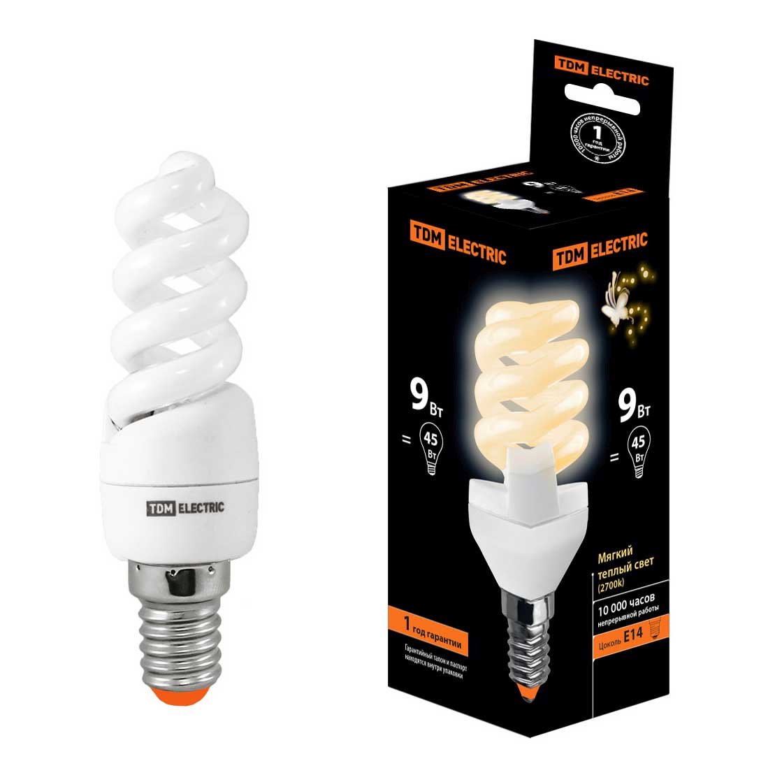 Энергосберегающая лампочка в форме спирали с цоколем E14 и размерами 99 мм по высоте и диаметром в 32 мм обладает мощностью в 9 W, благодаря чему она может осветить 1.8 кв. м. Цветовая температура – 2700 К, т.е. теплый свет, создающий атмосферу уюта. Изделие рассчитано на использование в сети с переменным напряжением в 220-240В.