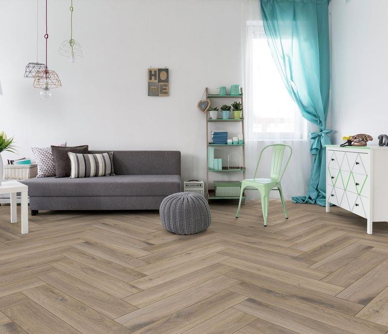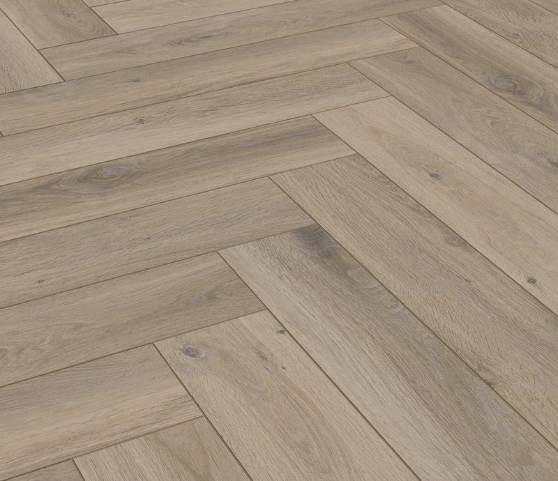 Роскошный светло-коричневый ламинат Herringbone Дуб Мец (Metz Oak) популярного бренда Kronotex в дизайне «Английской ёлочки». Реалистичный декор D3766 под морёный дуб с синхронной текстурой дерева на замковой системе EXPRESS CLICK.