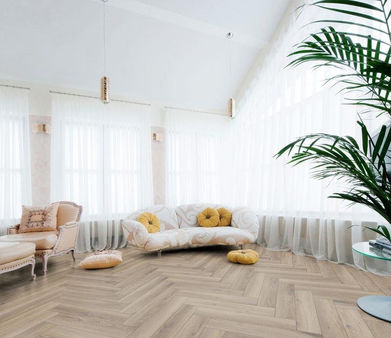 Ламинат Herringbone Дуб Мец был оптимизирован таким образом, чтобы выдерживать длительное воздействие влаги. Благодаря значительно сниженной характеристике разбухания подходит для влажных помещений.
