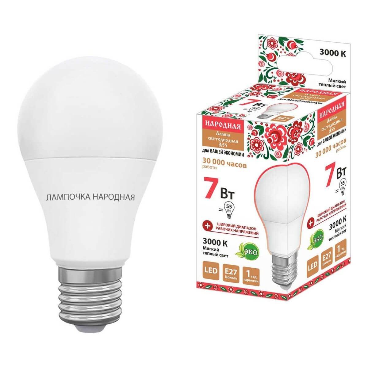 Светодиодная лампочка в форме шара с цоколем E27 и размерами 98 мм по высоте и диаметром в 60 мм обладает мощностью в 7 W, благодаря чему она может осветить 2.3 кв. м. Цветовая температура – 3000 К, т.е. теплый свет, создающий атмосферу уюта. Изделие рассчитано на использование в сети с переменным напряжением в 220-240В.