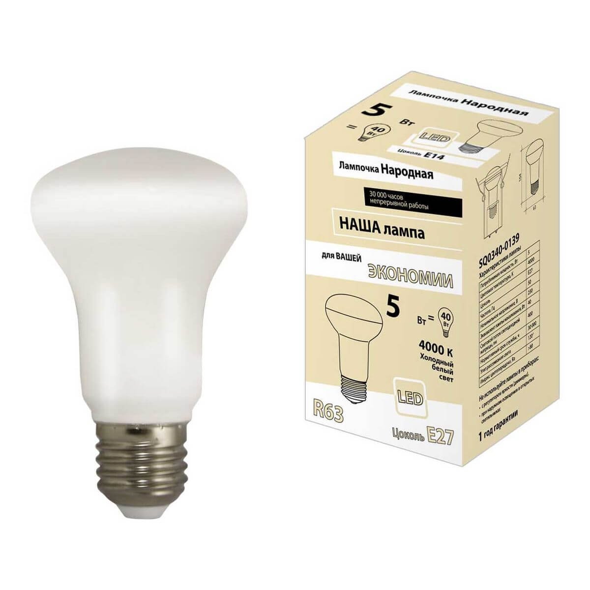 Светодиодная лампочка в форме рефлектора с цоколем E27 и размерами 104 мм по высоте и диаметром в 63 мм обладает мощностью в 5 W, благодаря чему она может осветить 1.7 кв. м. Цветовая температура – 4000 К, т.е. белый свет, подходящий для рабочего настроя (не рекомендуется для детской комнаты). Изделие рассчитано на использование в сети с переменным напряжением в 220-240В.