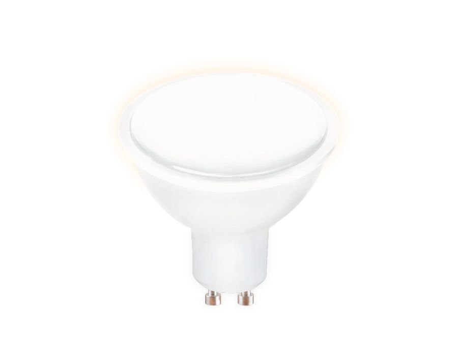 Светодиодная лампочка в форме полусферы с цоколем GU10 и размерами 56 мм по высоте и диаметром в 50 мм обладает мощностью в 8 W, благодаря чему она может осветить 2.7 кв. м. Цветовая температура – 3000 К, т.е. теплый свет, создающий атмосферу уюта. Изделие рассчитано на использование в сети с переменным напряжением в 220-240В.