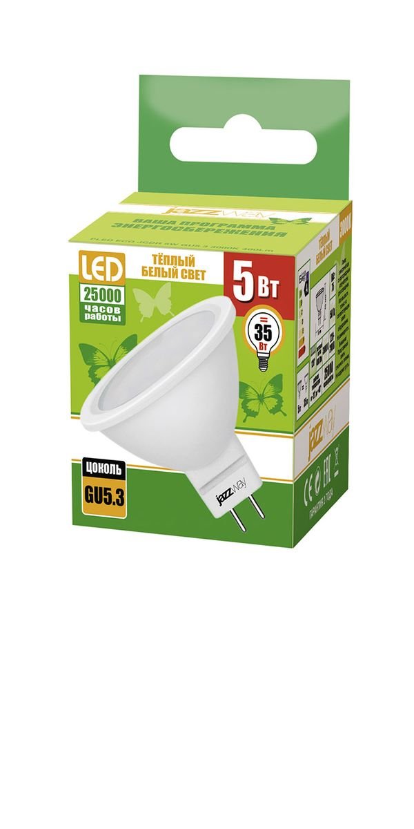 Светодиодная лампочка в форме полусферы с цоколем GU5.3 и размерами 54 мм по высоте и диаметром в 50 мм обладает мощностью в 5 W, благодаря чему она может осветить 1.7 кв. м. Цветовая температура – 3000 К, т.е. теплый свет, создающий атмосферу уюта. Изделие рассчитано на использование в сети с переменным напряжением в 220-240В.