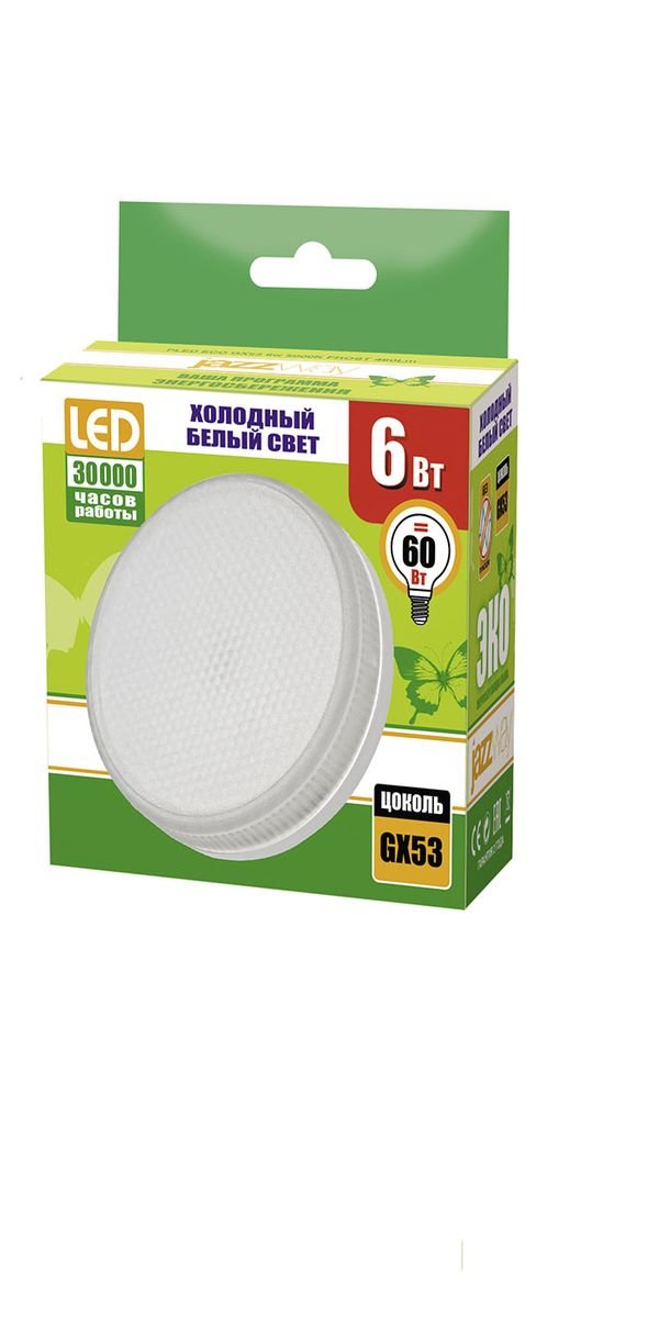 Светодиодная лампочка в форме таблетки с цоколем GX53 и размерами 26 мм по высоте и диаметром в 75 мм обладает мощностью в 6 W, благодаря чему она может осветить 2 кв. м. Цветовая температура – 5000 К, т.е. белый свет, подходящий для рабочего настроя (не рекомендуется для детской комнаты). Изделие рассчитано на использование в сети с переменным напряжением в 220-240В.