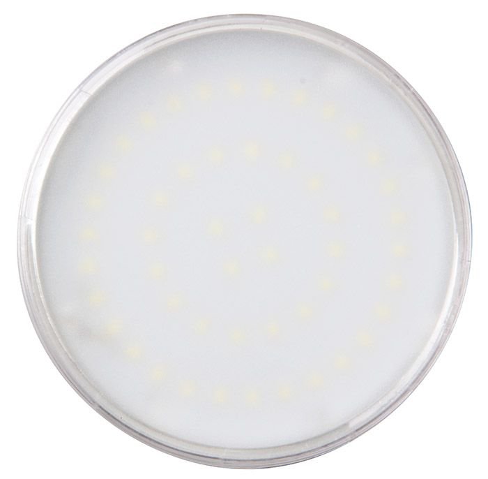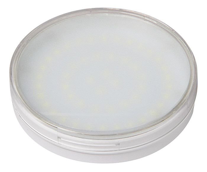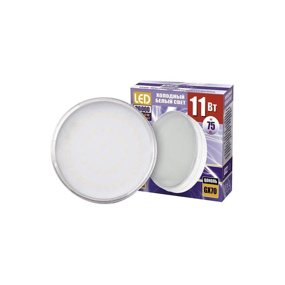Светодиодная лампочка в форме таблетки с цоколем GX70 и размерами 43 мм по высоте и диаметром в 110 мм обладает мощностью в 11 W, благодаря чему она может осветить 3.7 кв. м. Цветовая температура – 5000 К, т.е. белый свет, подходящий для рабочего настроя (не рекомендуется для детской комнаты). Изделие рассчитано на использование в сети с переменным напряжением в 220-240В.