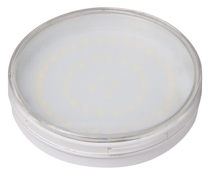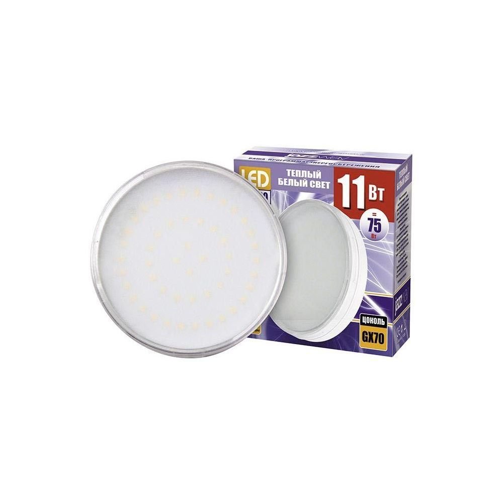 Светодиодная лампочка в форме таблетки с цоколем GX70 и размерами 43 мм по высоте и диаметром в 110 мм обладает мощностью в 11 W, благодаря чему она может осветить 3.7 кв. м. Цветовая температура – 3000 К, т.е. теплый свет, создающий атмосферу уюта. Изделие рассчитано на использование в сети с переменным напряжением в 220-240В.