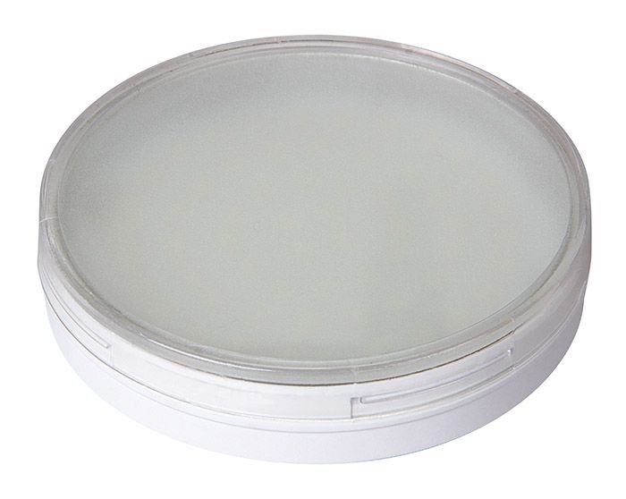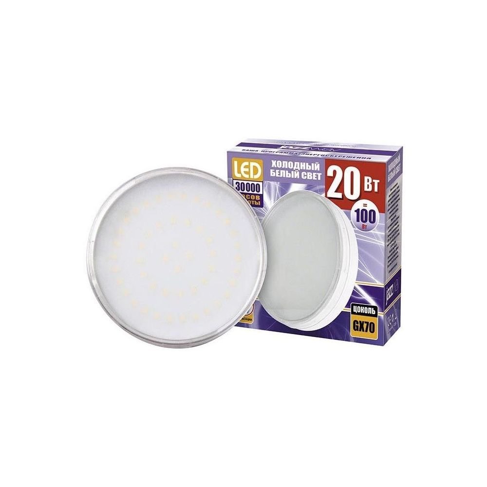 Светодиодная лампочка в форме таблетки с цоколем GX70 и размерами 45 мм по высоте и диаметром в 111 мм обладает мощностью в 20 W, благодаря чему она может осветить 6.7 кв. м. Цветовая температура – 5000 К, т.е. белый свет, подходящий для рабочего настроя (не рекомендуется для детской комнаты). Изделие рассчитано на использование в сети с переменным напряжением в 220-240В.