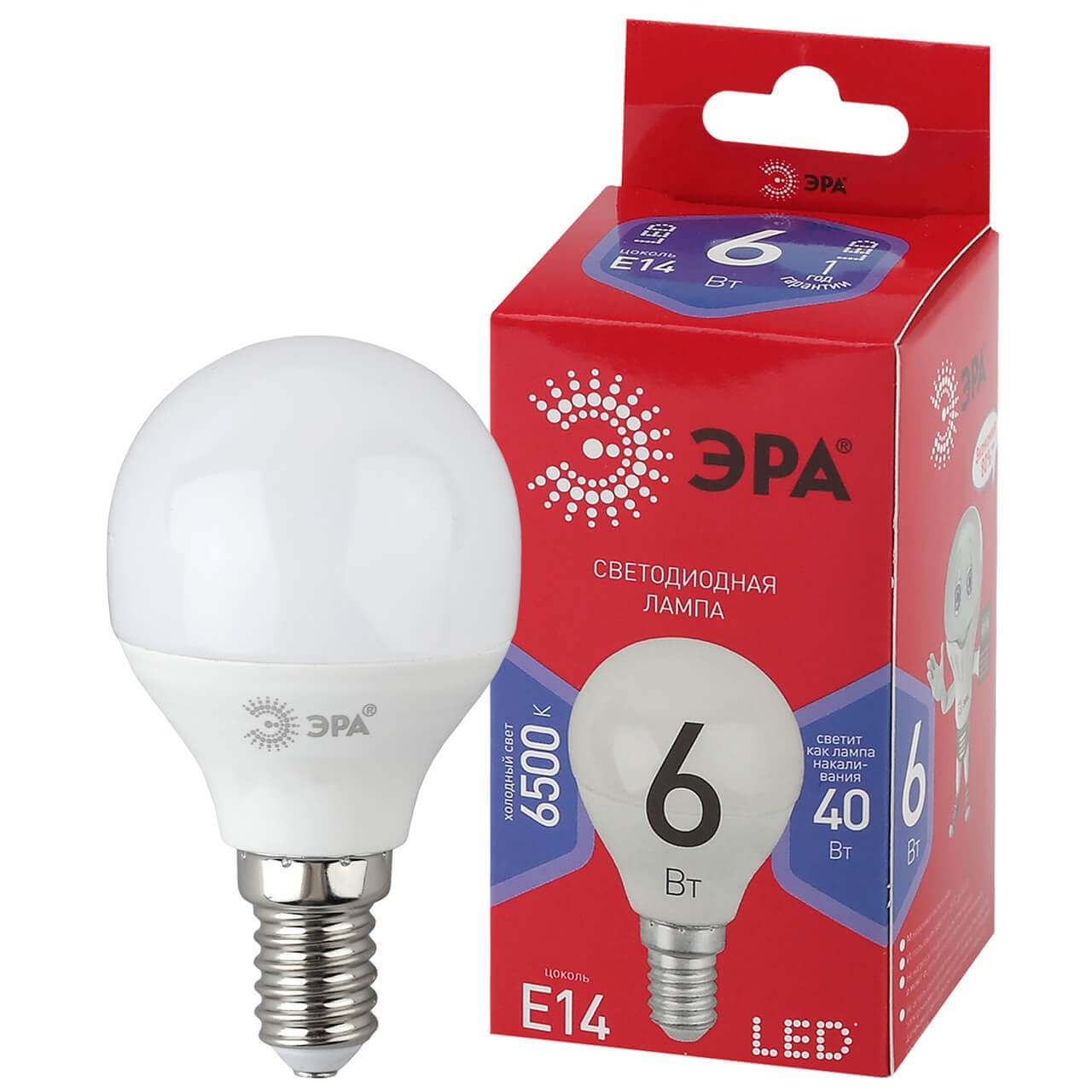 Светодиодная лампочка в форме шара с цоколем E14 и размерами 80 мм по высоте и диаметром в 45 мм обладает мощностью в 6 W, благодаря чему она может осветить 2 кв. м. Цветовая температура – 6500 К, т.е. холодный свет синего оттенка (не рекомендуется для применения на кухне, так как искажает цвет готовых блюд). Изделие рассчитано на использование в сети с переменным напряжением в 220-240В.