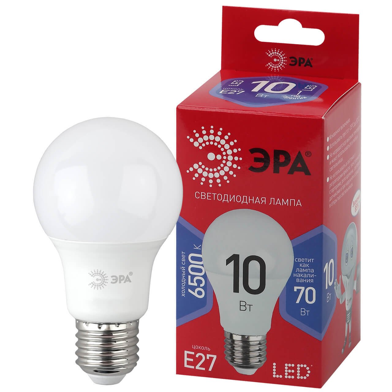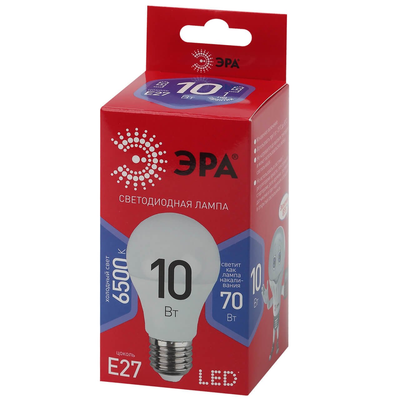 Светодиодная лампочка в форме груши с цоколем E27 и размерами 108 мм по высоте и диаметром в 60 мм обладает мощностью в 10 W, благодаря чему она может осветить 3.3 кв. м. Цветовая температура – 6500 К, т.е. холодный свет синего оттенка (не рекомендуется для применения на кухне, так как искажает цвет готовых блюд). Изделие рассчитано на использование в сети с переменным напряжением в 220-240В.