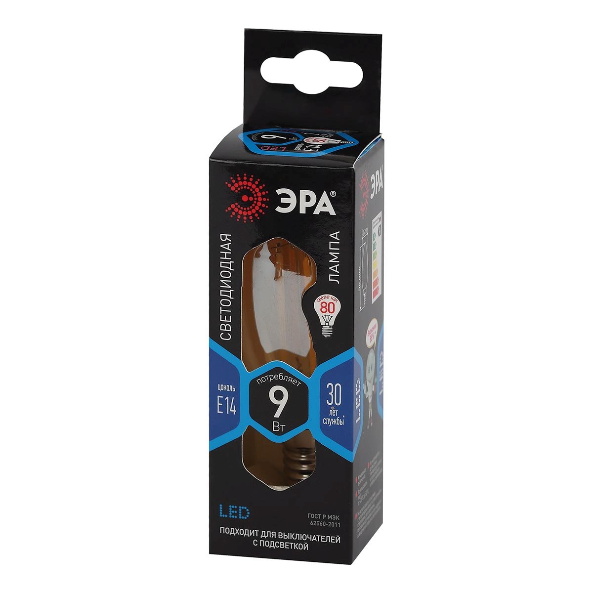 Светодиодная лампочка в форме свечи с цоколем E14 и размерами 100 мм по высоте и диаметром в 37 мм обладает мощностью в 9 W, благодаря чему она может осветить 3 кв. м. Цветовая температура – 4000 К, т.е. белый свет, подходящий для рабочего настроя (не рекомендуется для детской комнаты). Изделие рассчитано на использование в сети с переменным напряжением в 220-240В.