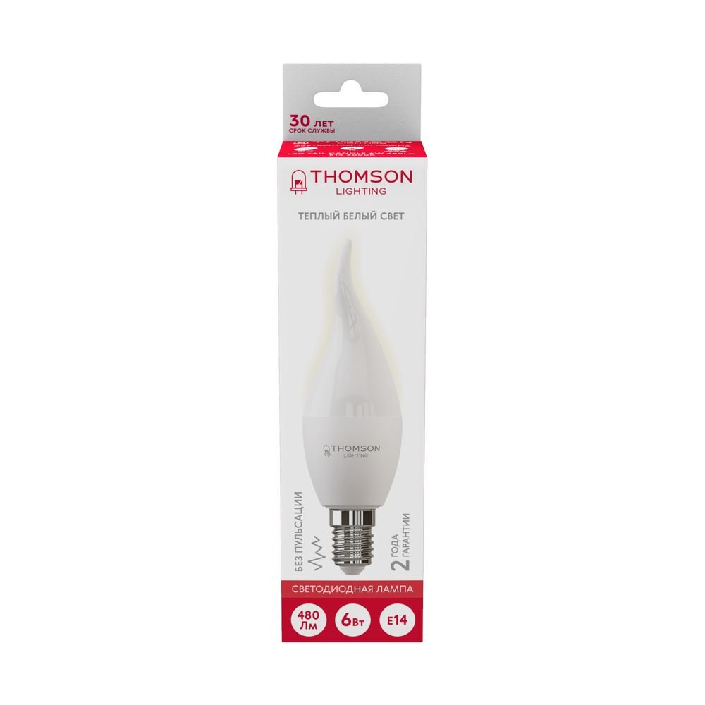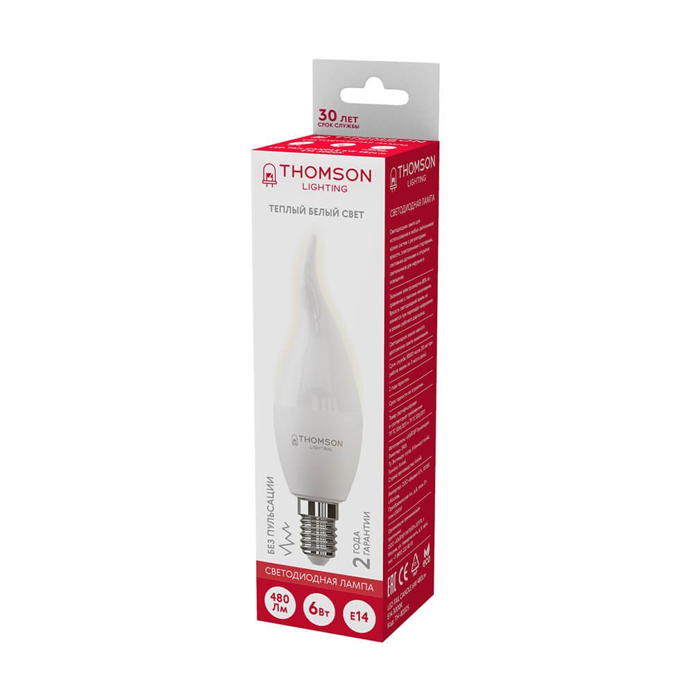 Светодиодная лампочка в форме свечи на ветру с цоколем E14 и размерами 130 мм по высоте и диаметром в 40 мм обладает мощностью в 6 W, благодаря чему она может осветить 2.5 кв. м. Цветовая температура – 3000 К, т.е. теплый свет, создающий атмосферу уюта. Изделие рассчитано на использование в сети с переменным напряжением в 170-265В.