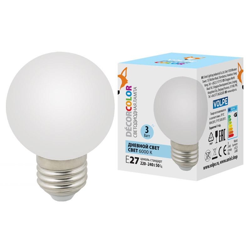 Светодиодная лампочка в форме шара с цоколем E27 и размерами 80 мм по высоте и диаметром в 60 мм обладает мощностью в 3 W, благодаря чему она может осветить 1 кв. м. Цветовая температура – 6000 К, т.е. холодный свет синего оттенка (не рекомендуется для применения на кухне, так как искажает цвет готовых блюд). Изделие рассчитано на использование в сети с переменным напряжением в 220-240В.