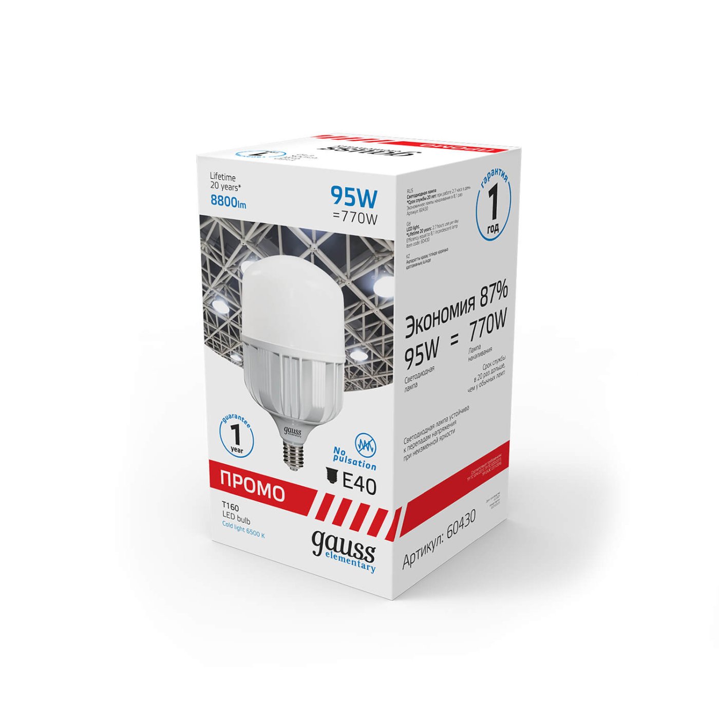Светодиодная лампочка в форме груши с цоколем E40 обладает мощностью в 95 W, благодаря чему она может осветить 31.7 кв. м. Цветовая температура – 6500 К, т.е. холодный свет синего оттенка (не рекомендуется для применения на кухне, так как искажает цвет готовых блюд). Изделие рассчитано на использование в сети с переменным напряжением в 220-240В.