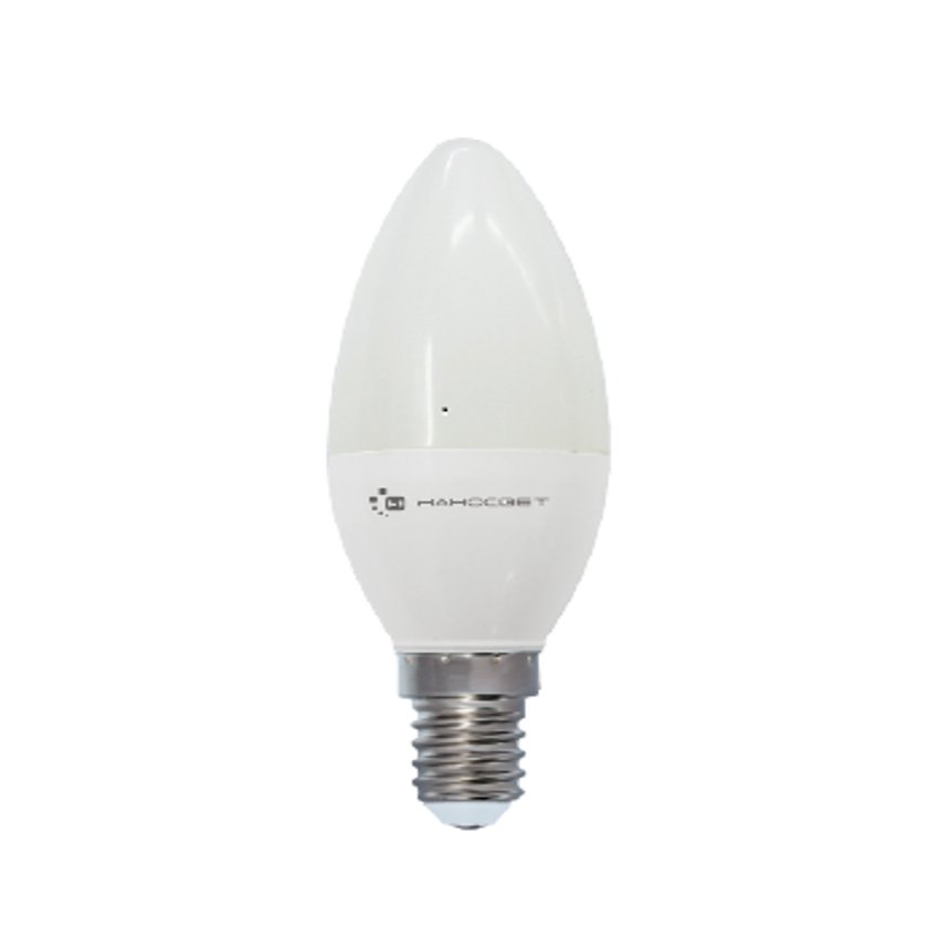 Светодиодная лампочка в форме свечи с цоколем E14 и размерами 112 мм по высоте и диаметром в 38 мм обладает мощностью в 6 W, благодаря чему она может осветить 2 кв. м. Цветовая температура – 4000 К, т.е. белый свет, подходящий для рабочего настроя (не рекомендуется для детской комнаты). Ориентировочный срок службы заявленный производителем Наносвет составляет 30000 ч. Изделие рассчитано на использование в сети с переменным напряжением в 220-240В.