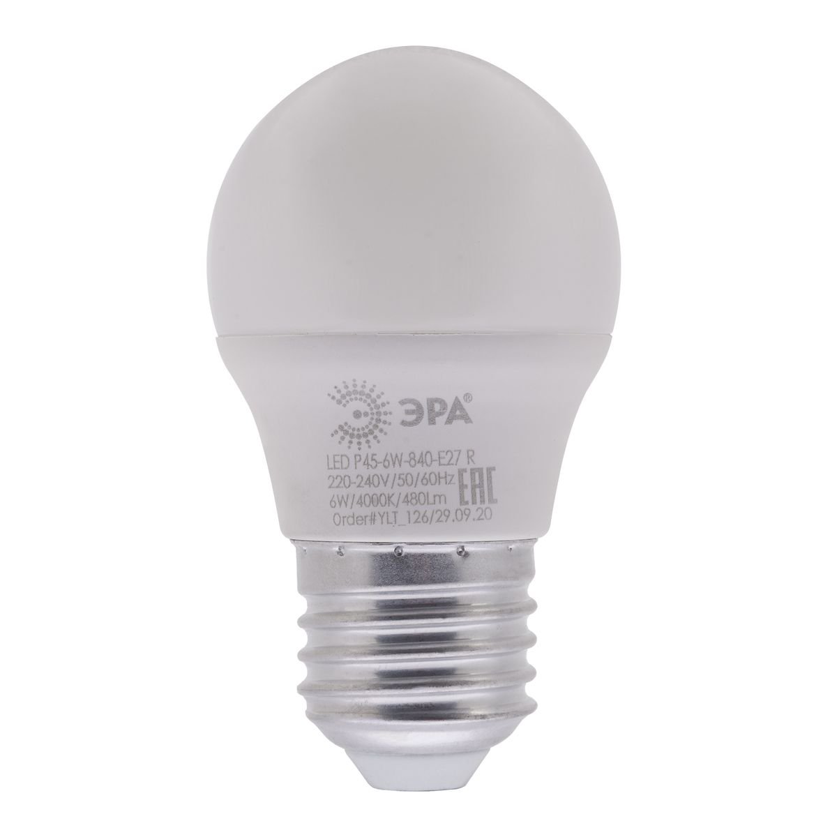 Светодиодная лампочка в форме шара с цоколем E27 и размерами 85 мм по высоте и диаметром в 45 мм обладает мощностью в 6 W, благодаря чему она может осветить 2 кв. м. Цветовая температура – 4000 К, т.е. белый свет, подходящий для рабочего настроя (не рекомендуется для детской комнаты). Изделие рассчитано на использование в сети с переменным напряжением в 220-240В.