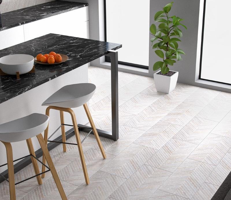 Влагостойкий виниловый SPC пол 34 класса Stone в декоре ёлочка Грайз Вавилон (Greige Babylon) кремового цвета с 4V фаской по периметру на замковой системе 1click 2go pure, толщиной 5 мм от производителя Kronospan. Дизайн выполнен под плитку Уникальное отличие плитки Rocko — вместо пленок материал покрывается тремя слоями акрилового лака с тиснением. Напольное покрытие Rocko Stone Грайз Вавилон (R130) продаётся упаковками по 11 планок размером 295×600 мм общей площадью 1,95 м².