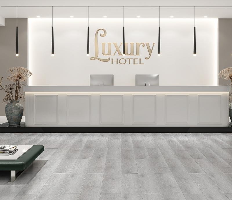 Влагостойкое виниловое покрытие 42 класса Sense в однополосном декоре Дуб Дженне (Djenne Oak) светло-серого цвета с фаской по периметру для замковой укладки, толщиной 4 мм от производителя Royce.