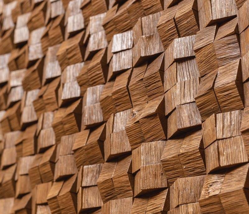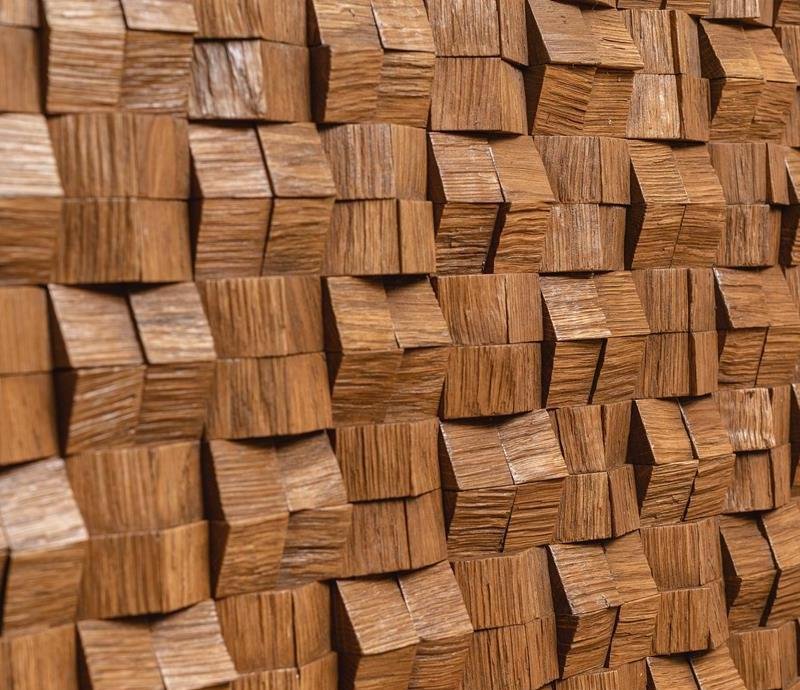 Декоративная мозаика для стен Домчик Коньяк от Российского производителя Crownwood из брашированного массива дуба под тонированным УФ-маслом. Дизайн выполнен в форме колотых под искосок 3D пикселей форматом 30х30 мм коньячного цвета. Каждая панель размером 300x300 мм соединяется с помощью системы Шип-Паз и занимает толщину 6-20 мм. Настенная мозаика Domchik Cognac изготавливается только под заказ и поставляется упаковками по несколько модулей общей площадью 0,63 м². В 1 кв.м. входит ± 11 модулей. Гарантия на продукцию до 30 лет.