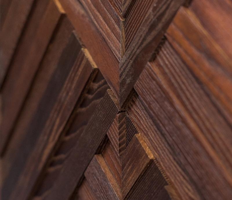 Декоративная мозаика для стен WP3D17Т20 Колос от Российского производителя Crownwood из брашированного массива термоясеня покрытого тиковым маслом. Дизайн выполнен в форме диагональных реек в форме колоса. Каждая панель размером 390×390 мм играет по толщине от 6 до 18 мм. Настенная мозаика Spike изготавливается исключительно под заказ и поставляется поштучно модулями площадью 0,152 м². В 1 кв.м. входит ± 6,6 модулей. Гарантия на продукцию до 30 лет.