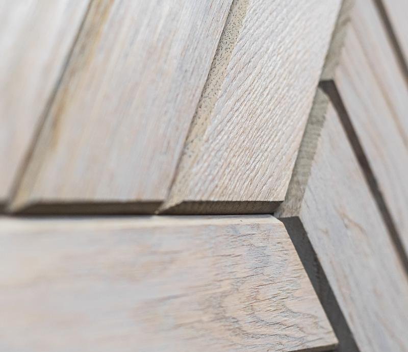 Декоративная мозаика для стен WP3D22010 Куба серый от Российского производителя Crownwood из брашированного дуба покрытого восковой лазурью. Дизайн выполнен в форме шестигранников состоящих из трёхполосных ромбов светло-серого цвета. Каждая панель размером 180×210 мм толщиной 12 мм. Настенная мозаика Cuba Grey изготавливается исключительно под заказ и поставляется поштучно модулями площадью 0,038 м². В 1 кв.м. входит ± 26 модулей. Гарантия на продукцию до 30 лет.