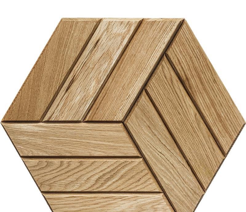 Декоративная мозаика для стен WP3D22020 Куба натур от Российского производителя Crownwood из брашированного дуба покрытого маслом с твердым воском. Дизайн выполнен в форме трёхполосных ромбов натурального цвета. Каждая панель размером 180×210 мм толщиной 12 мм. Настенная мозаика Cuba Natur изготавливается исключительно под заказ и поставляется поштучно модулями площадью 0,038 м². В 1 кв.м. входит ± 26 модулей. Гарантия на продукцию до 30 лет.