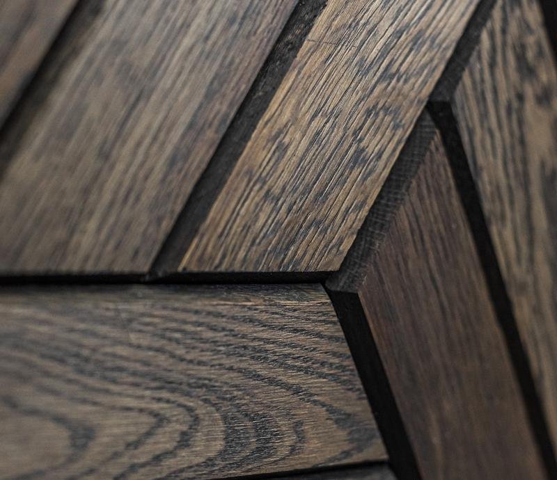 Декоративная мозаика для стен WP3D22060 Куба Эбен от Российского производителя Crownwood из брашированного дуба покрытого тёмным маслом. Дизайн выполнен в форме шестигранников состоящих из трёхполосных ромбов тёмно-коричневого цвета. Каждая панель размером 180×210 мм толщиной 12 мм. Настенная мозаика Cuba Ebony изготавливается исключительно под заказ и поставляется поштучно модулями площадью 0,038 м². В 1 кв.м. входит ± 26 модулей. Гарантия на продукцию до 30 лет.