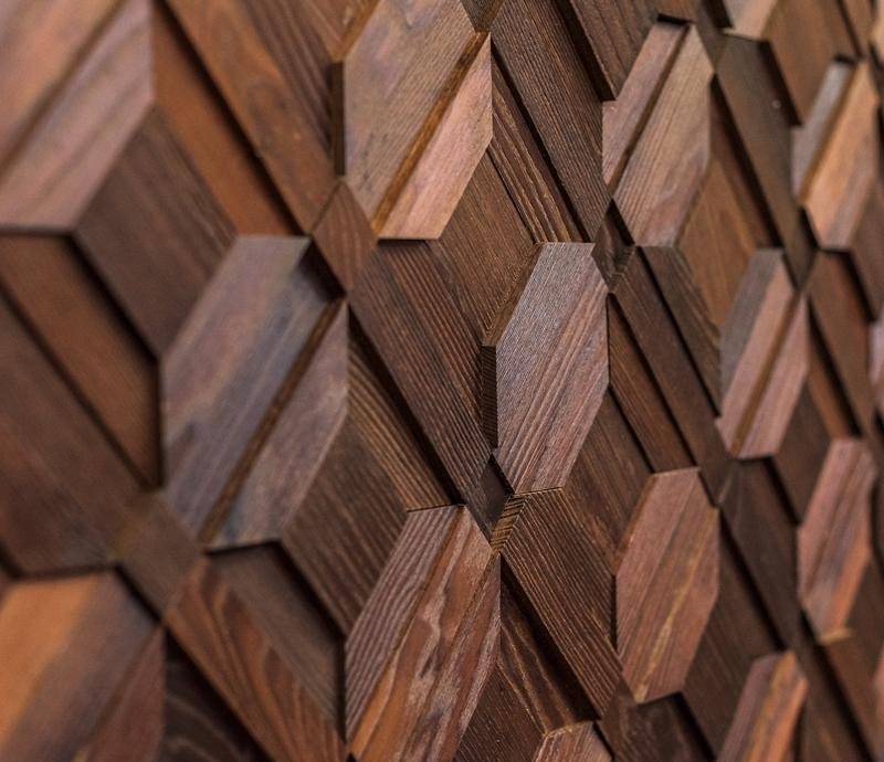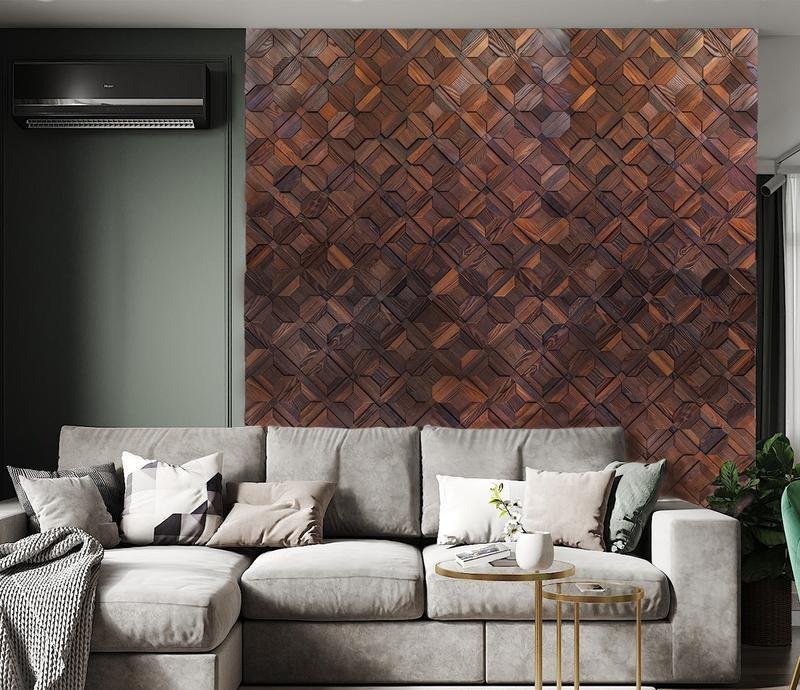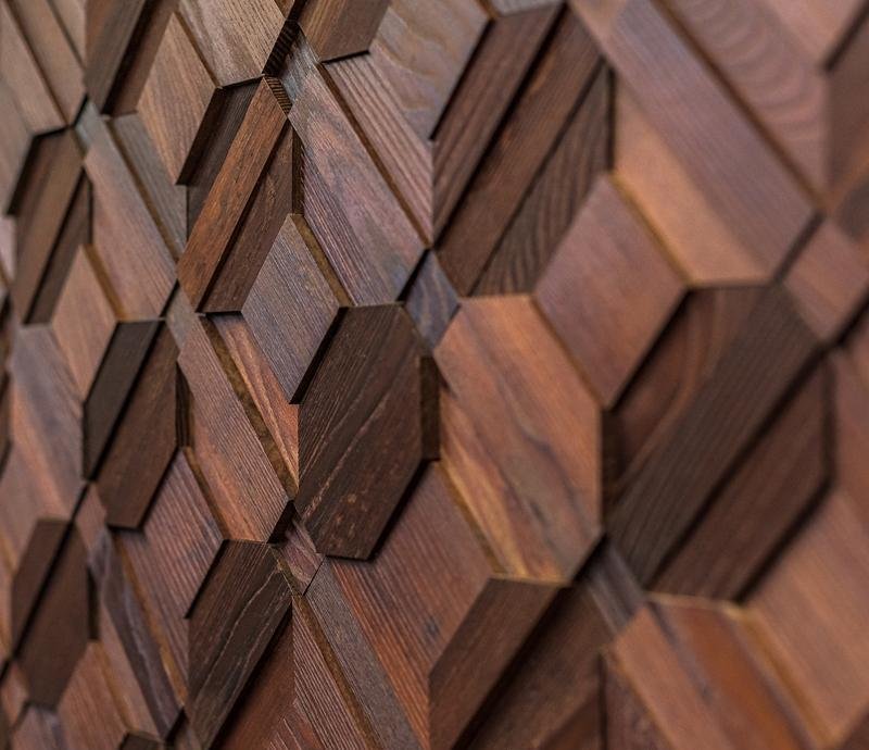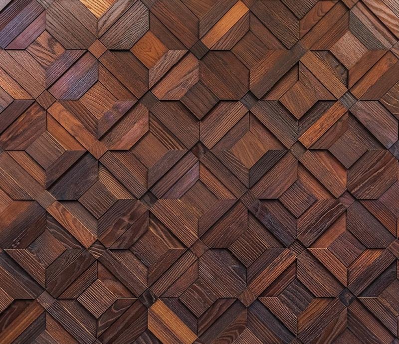 Декоративная мозаика для стен WP3D8Т20 Восток термо от Российского производителя Crownwood из брашированного термоясеня покрытого тиковым маслом. Дизайн выполнен в форме геометрических 3D фигур цвета красного дерева. Каждая панель размером 425×425 мм играет по толщине от 4 до 18 мм. Настенная мозаика East thermo изготавливается исключительно под заказ и поставляется поштучно модулями площадью 0,18 м². В 1 кв.м. входит ± 5,5 модулей. Гарантия на продукцию до 30 лет.