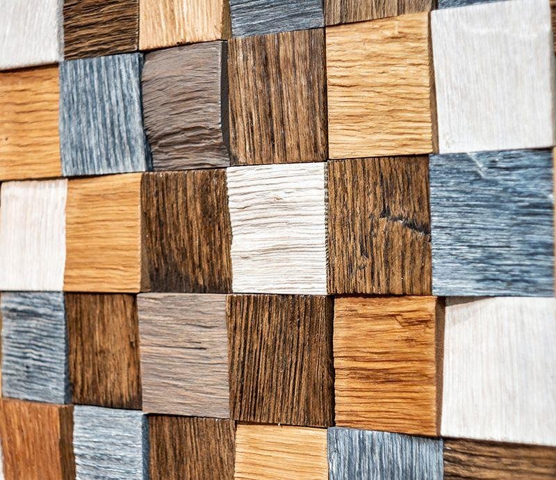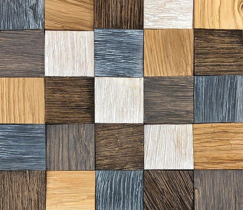 Декоративная мозаика для стен WPART2 Пиксель (Pixel) от Российского производителя Crownwood из натурального массива колотого дуба с эффектом браширования. Дизайн выполнен в форме цветных 3D квадратиков (пикселей) 60х60 мм в пяти цветах: естественный, венге, белый, серый и дымка, покрытых маслом. Каждая панель размером 300x300 мм соединяется с помощью системы Шип-Паз и занимает толщину с перепадом от 4 до 16 мм. Настенная мозаика Pixel изготавливается исключительно под заказ и поставляется упаковками по 11 модулей общей площадью 0,63 м². Гарантия на продукцию до 30 лет.