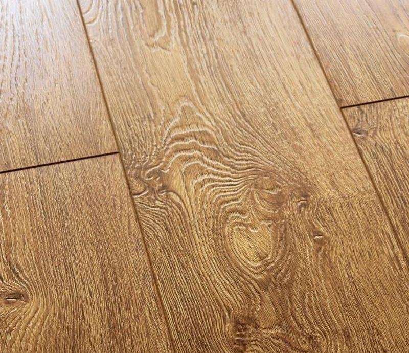 Однополосный ламинат 34 класса Step-by-Step в декоре дуба Вурден (Oak Woerden) карамельного цвета от производителя Westerhof толщиной 8 мм, на замковой системе Mini Strong Special click с V фаской по периметру. поверхность с текстурой дуба.