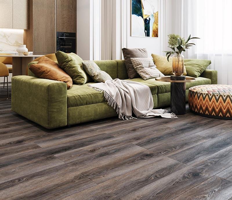Влагостойкое виниловое SPC покрытие 43 класса ELTZ 4V в однополосном декоре Дуб Эльба (Elba Oak) коричнево-серого цвета с фаской по периметру для способа укладки, толщиной 4 мм от Российского производителя Stronghold. Напольное покрытие ELTZ 4V Дуб Эльба (8014-4) продаётся упаковками по 10 планок размером 1200×180×4 мм общей площадью 2.16 м².