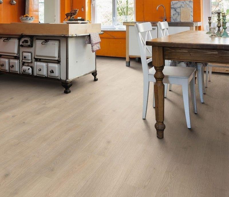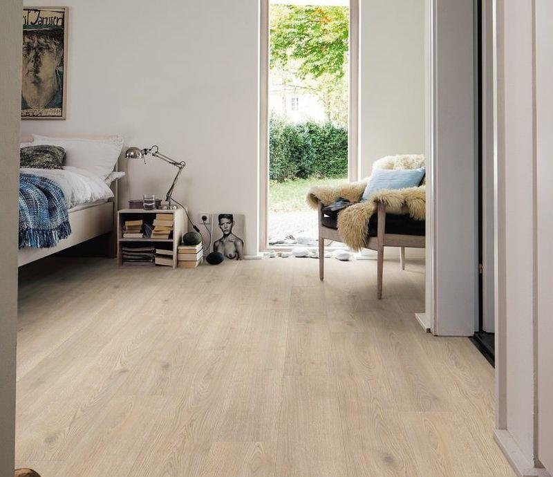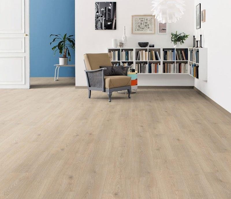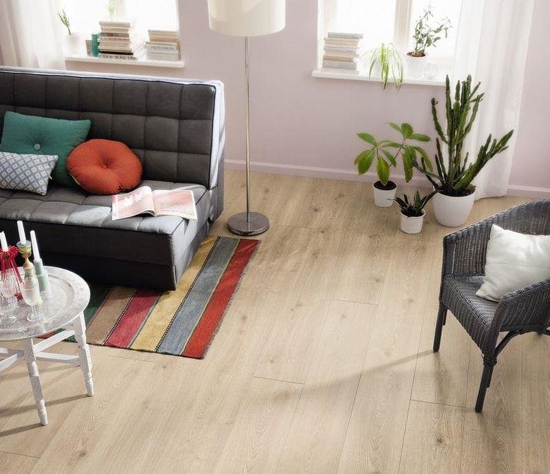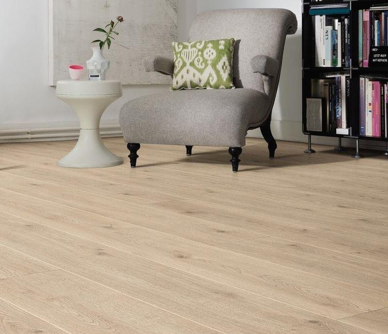 Экстраширокий светло-коричневый ламинат 32 класса Tritty 100 Gran Via 4V 531917 Дуб Контура каменно-серый от немецкого производителя HARO толщиной 8 мм на замковой системе Top Connect. Однополосный декор с фаской и изолирующей подложкой Silent Pro.