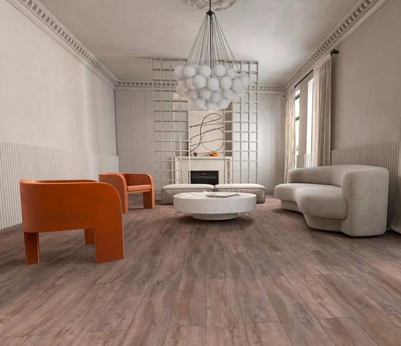 Водостойкий SPC ламинат 43 класса Villa в декоре Дуб Виано (Viano Oak) коричнево-серого цвета от производителя Betta толщиной 4.5 мм. Планки на замковой системе Click с фаской по периметру укладывается плавающим способом на специальную подложку. Напольное покрытие Villa Дуб Виано (V101) продаётся упаковками по 10 планок размером 184×1220 мм общей площадью 2,248 м². Предоставляется гарантия производителя Betta в 25 лет.