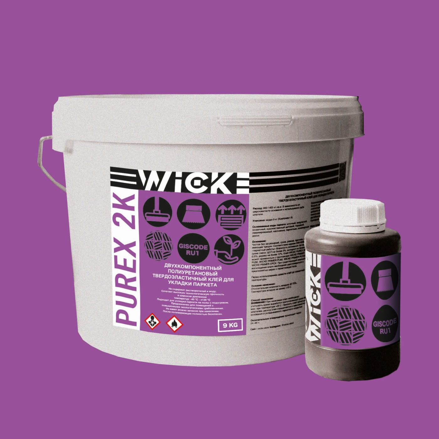 Между неподвижными конструкциями, такими как стена и паркет, оставлять зазор 10-15 мм. Шлифование и лакирование паркета проводить только через 12 часов после приклеивания. Свежие пятна клея можно удалить средством для очистки WICKE SOFT, а высохший клей только механически.